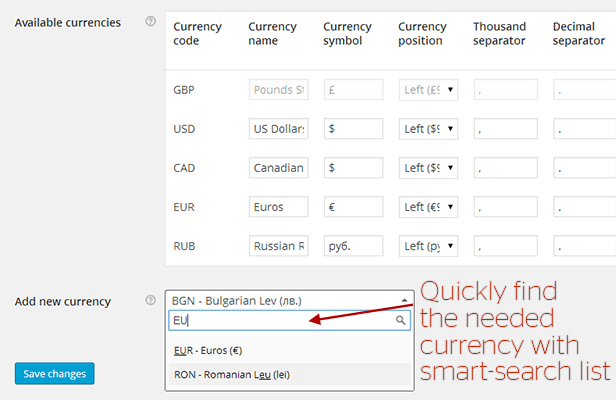Every currency is customizable independently from the others – each can have different format, different number of decimals etc.